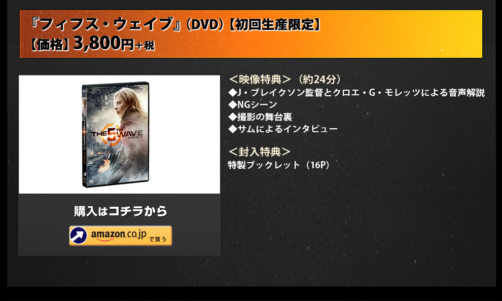 リック・ヤンシーの大ベストセラー小説を実写映画化したSFアクション巨編。地球に突如現れた知的生命体<アザーズ>が人類滅亡を企む中、クロエ・グレース・モレッツ演じる女子高生キャシーが離れ離れになった弟を捜し出そうと奮闘する。<アザーズ>の波状攻撃による迫力のディザスター映像や戦闘アクションも見応えあり!