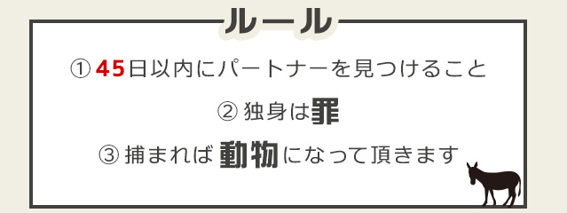 そこで45日以内にパートナーを見つけなければ、自ら選んだ動物に変えられ、森に放たれる、そんな近未来。